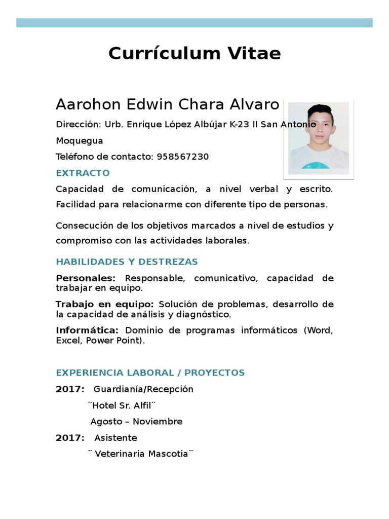 Depois de baixar um modelo pronto, veja a matéria de como montar um curriculum vitae simples corretamente e facilitar o envio a quem interessa: El currículum, currículo o curriculum vitae (esta última, hasta 2010, hispanizada como currículum vítae; Añade un pequeño extracto al principio de tu currículum en el que te expliques tu motivación por aprender y tener tu primera experiencia laboral en el puesto de empleo solicitado. Seja em papel ou em formato digital, um curriculum vitae bem redigido permite que se apresente e destaque o seu percurso profissional de forma a chamar a atenção. Saber se utilizar das palavras é fundamental nesse caso.